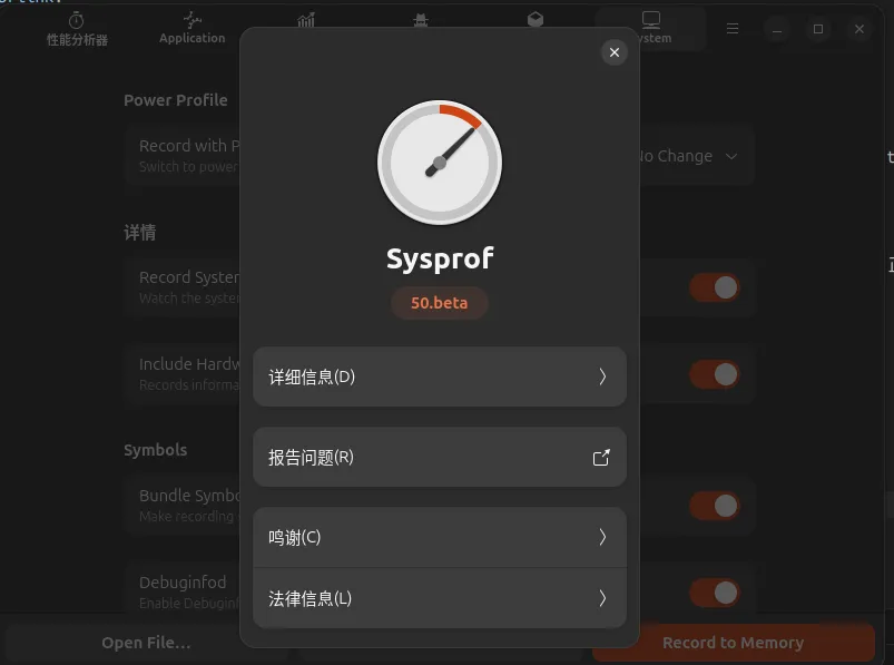 Sysprof 是一款系统性能分析工具,现在在 Ubuntu 26.04 中默认预装。它可以帮助开发者记录和分析系统性能,找出性能瓶颈,对系统调试和优化非常有帮助。当前版本为 50.beta。