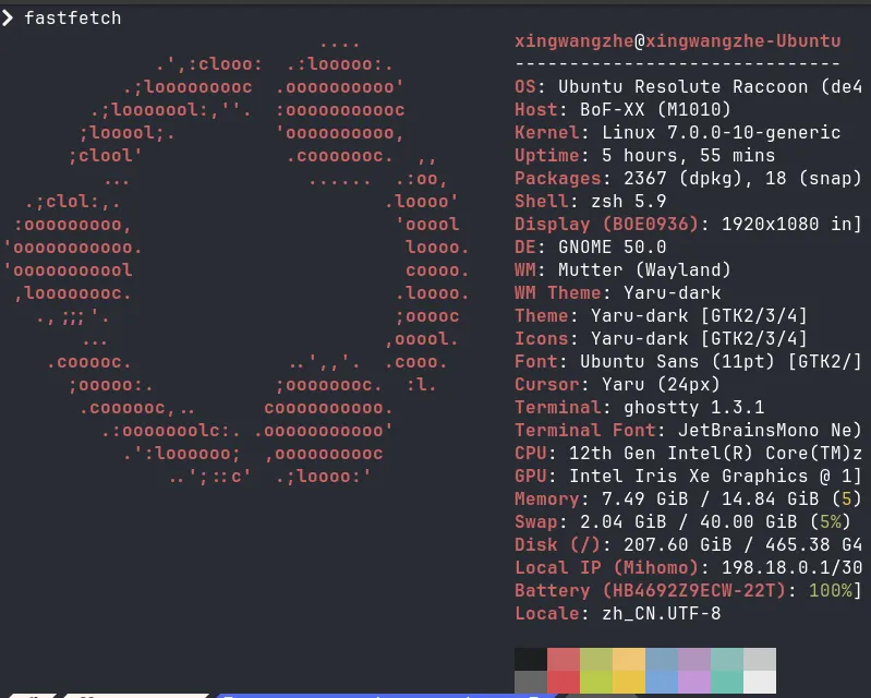 可以看到我安装的 Ubuntu 26.04-beta 已经升级到了 Linux 内核 7.0.0-10-generic,GNOME 版本也更新到了 50.0,配合 Yaru-dark 深色主题,整体视觉效果非常协调。终端使用的是我自己安装的的 ghostty,体验很棒。
